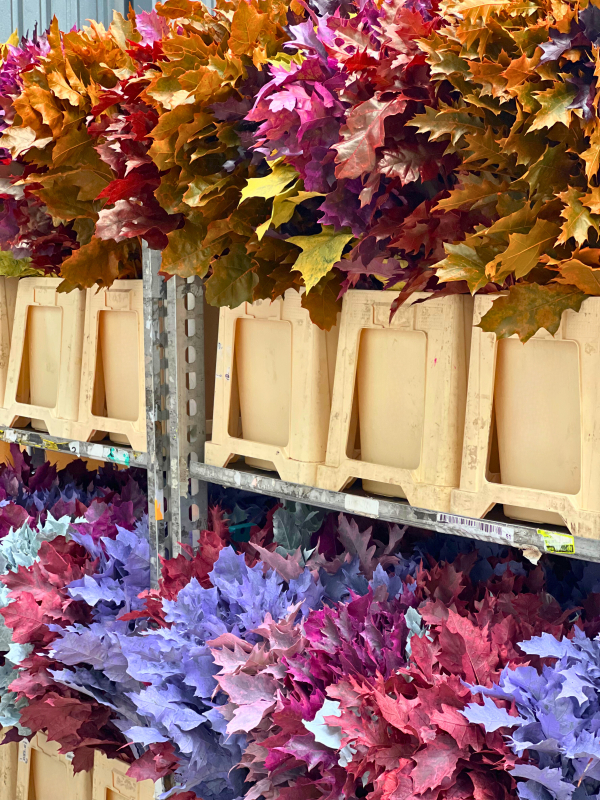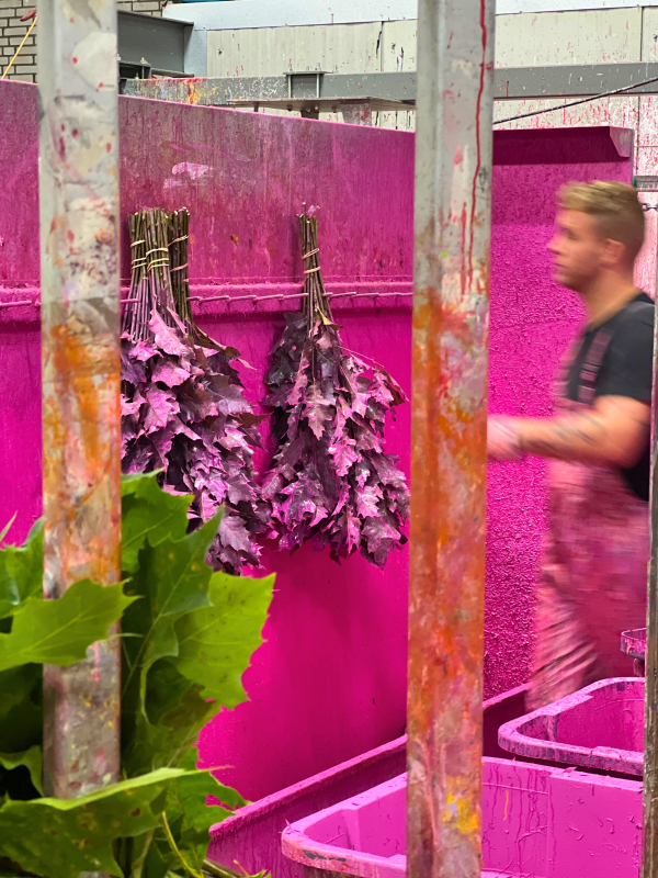 Jim warmly welcomes us and provides us with a tour. He shows us how the coloring process takes place. In different booths, the flowers and branches are painted. Afterward, they are hung up to dry. The bunches disappear into a space where they are dried with air and wind. It's incredibly fascinating and enjoyable to follow this process!
