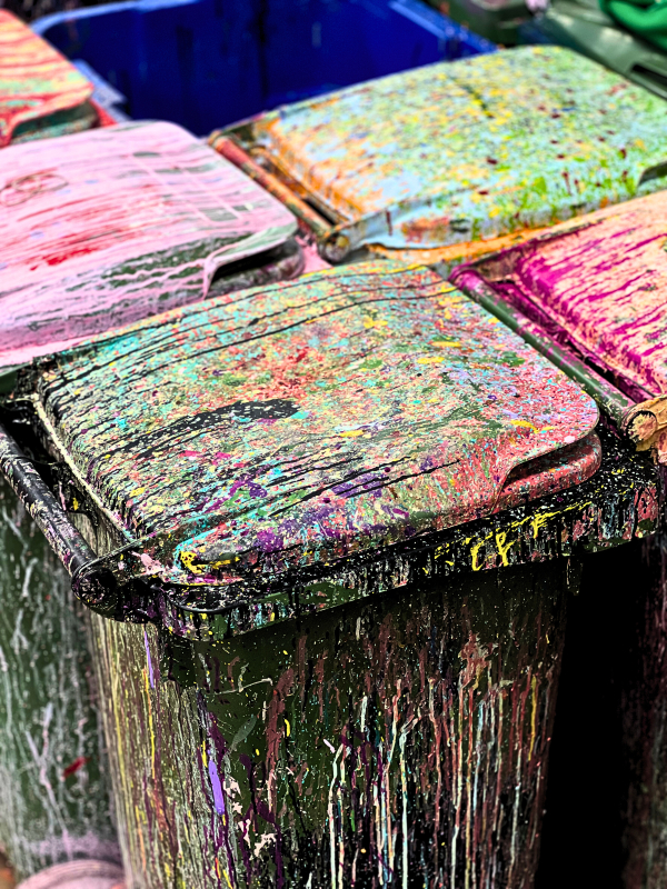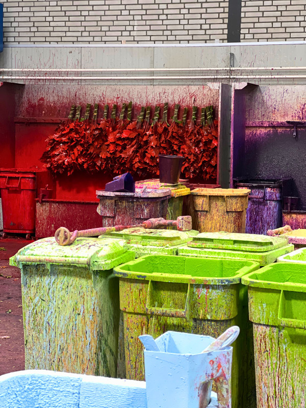 As soon as we step inside Jimmy Colors, we find ourselves in a true paradise of colors. Color is everywhere: containers filled with various paint colors, booths with all the colors of the rainbow, we see colored birch bundles hanging upside down from rails, and the employees are dressed in overalls covered in splatters of paint in various different hues. We are immediately impressed.